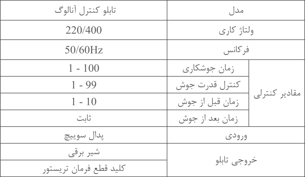 دارای ولوم کنترل زمان جوشکاری، کنترل قدرت، زمان قبل از جوش، زمان بعد از جوش (ثابت)